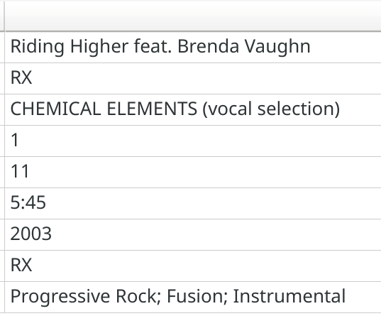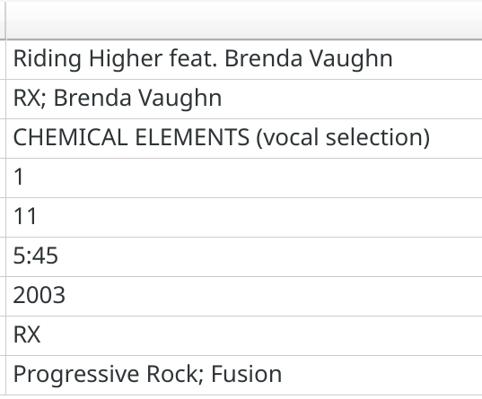 [arimasou16@local]$ beet write Riding\ Higher\ feat.\ Brenda\ Vaughn RX CHEMICAL ELEMENTS (vocal selection) Riding Higher feat. Brenda Vaughn
